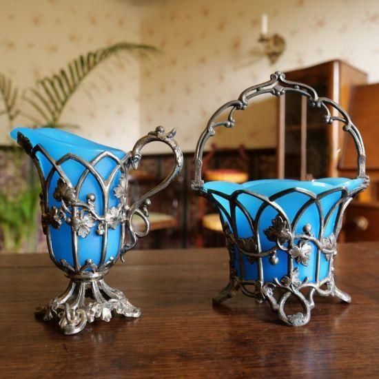 1850ǯÂå¤ËÀ½ºî¤µ¤ì¤¿¥Ö¥ê¥¿¥Ë¥¢¥á¥¿¥ëÀ½¤ÎÆ©¤«¤·ºÙ¹©¡Ê¥ª¡¼¥×¥ó¥ï¡¼¥¯¡Ë¤È¡¢Á¯¤ä¤«¤Ê¥Ö¥ë¡¼¥¬¥é¥¹¤Î¥¤¥ó¥µ¡¼¥È¤òÁȤ߹ç¤ï¤»¤¿¡¢ÂçÊÑ´õ¾¯¤Ê¥ß¥ë¥¯¡õ¥·¥å¥¬¡¼¥»¥Ã¥È¤Ç¤¹¡£